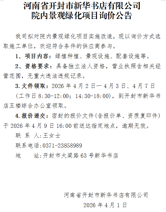 河南省开封市新华书店有限公司院内景观绿化项目询价公告